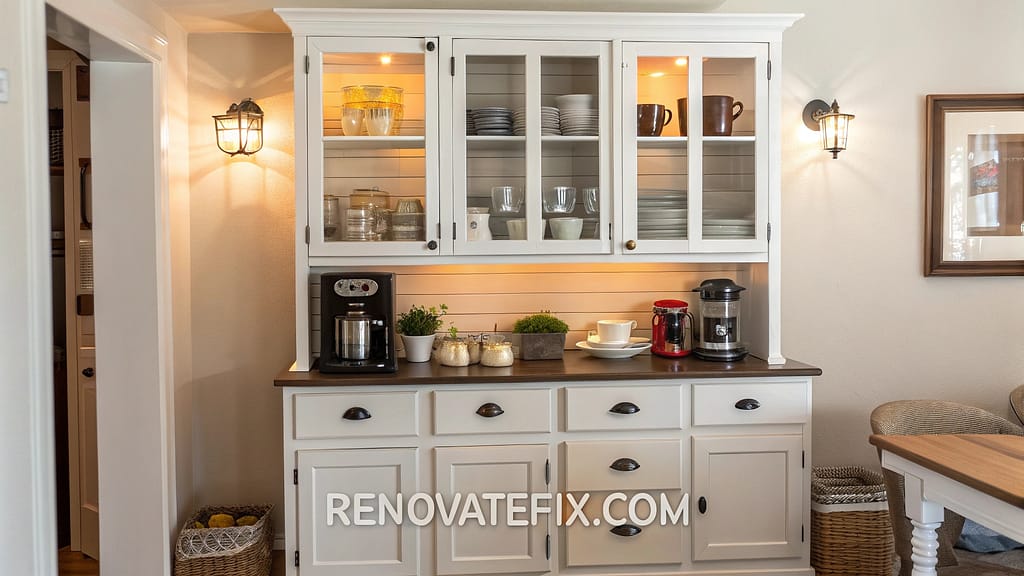 Vintage cabinet finds new life as dedicated brewing center. Glass-front doors protect equipment while displaying contents.