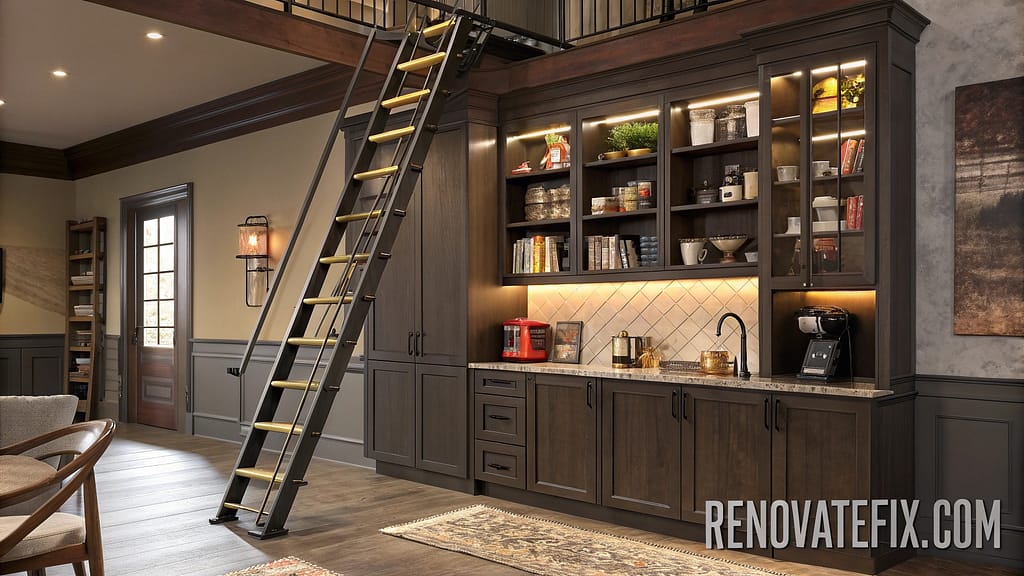 Modified library ladder system allows access to elevated storage while adding architectural interest.