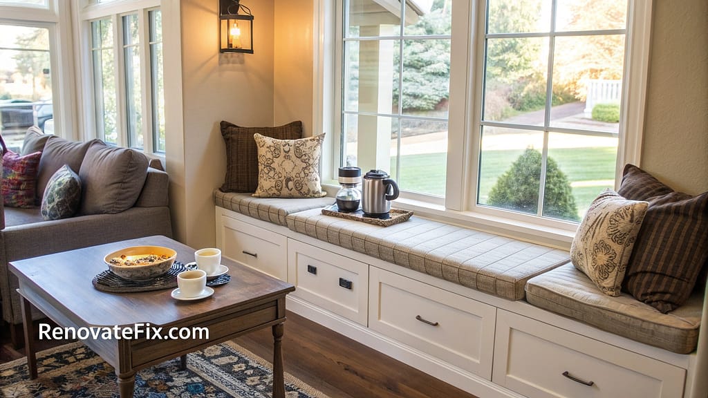 Storage drawers utilize depth beneath cushioned bench. Morning light streams through windows creating perfect atmosphere for coffee moments.