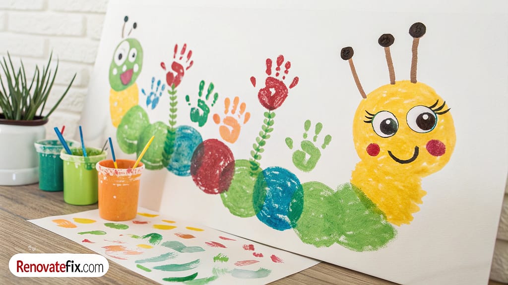 Use fine-tipped markers drawing tiny legs beneath prints, create facial features leading print completing characteristic caterpillar appearance.