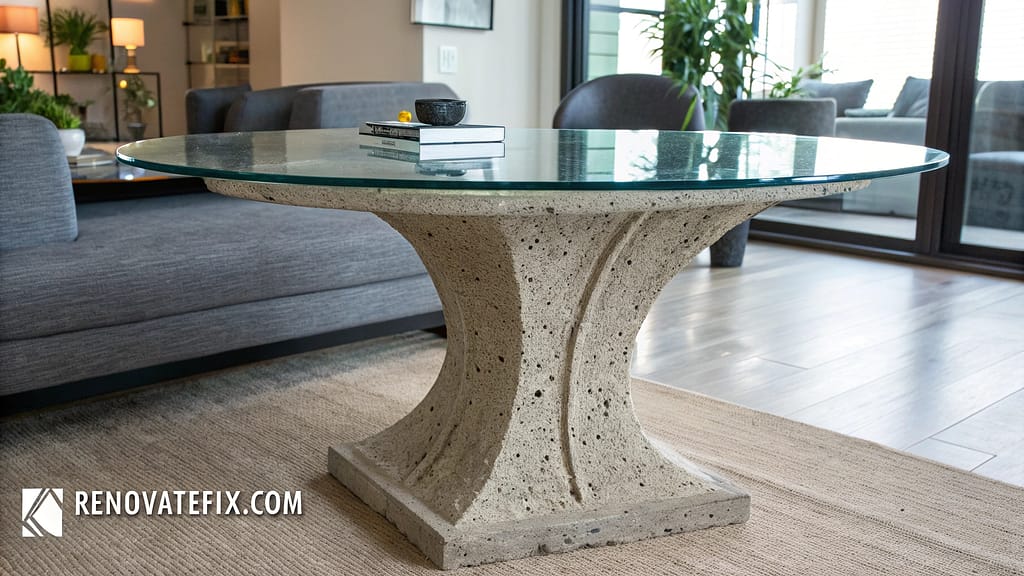 Sculptural concrete pedestals supporting glass tops create conversation-starting furniture pieces.