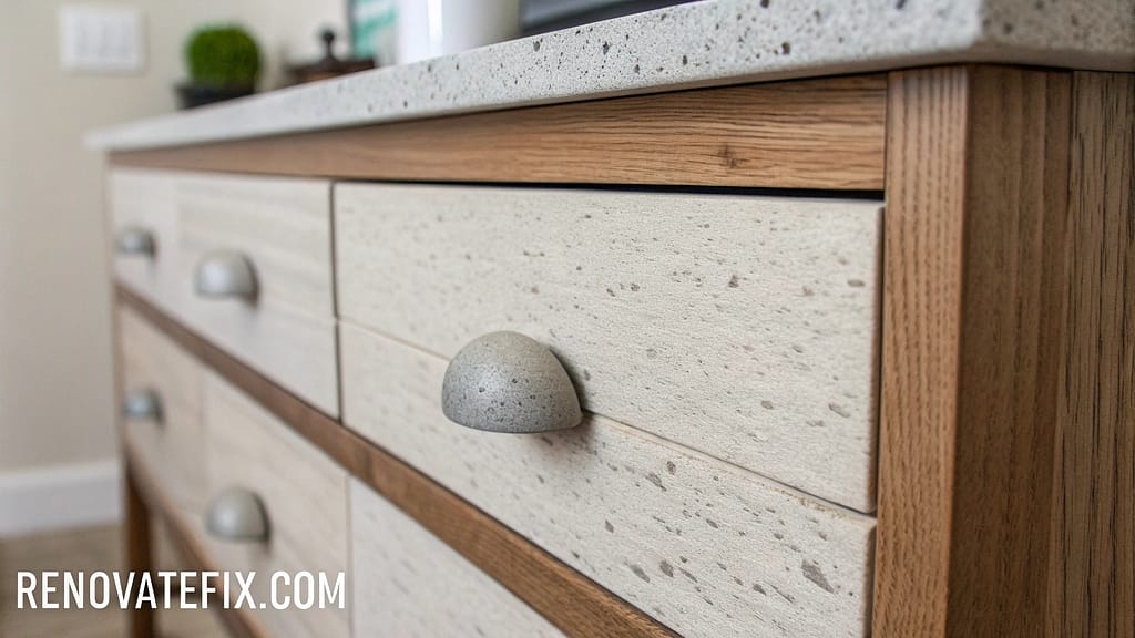 Hand-cast concrete handles add industrial flair to furniture pieces.