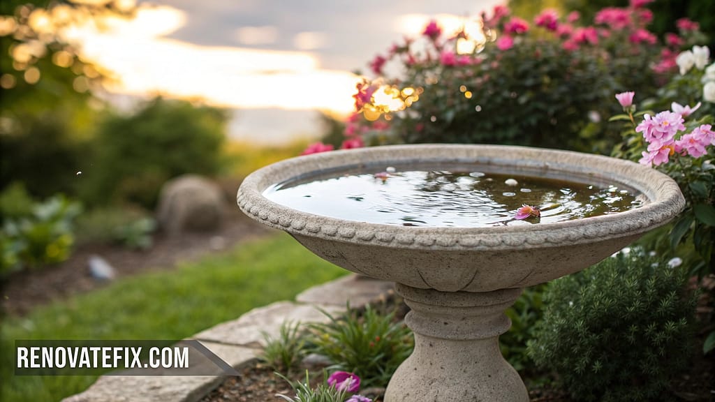 Elevated concrete pedestals topped with shallow water basins attract feathered visitors to gardens.