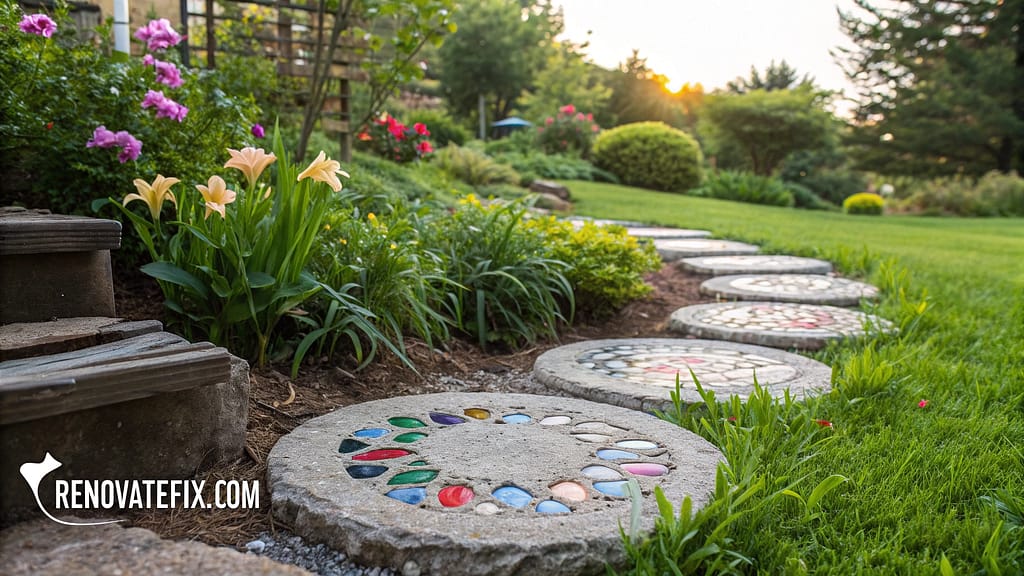 Personalized concrete pavers featuring embedded materials like glass beads or natural stones guide visitors through garden spaces.
