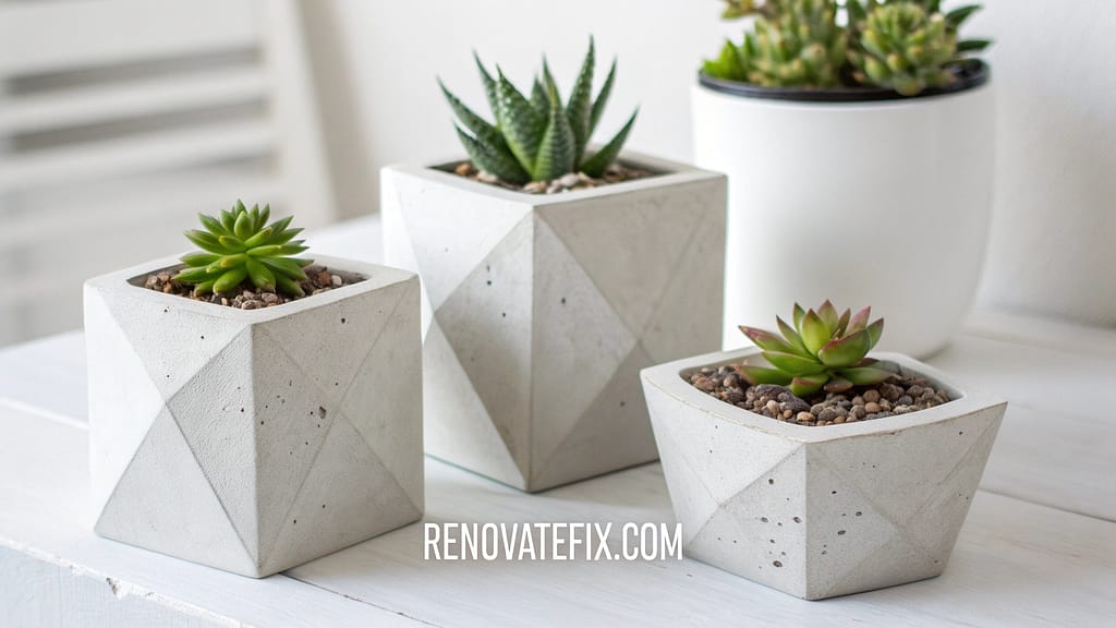Raw concrete molded into angular vessels creates striking containers for succulents and small plants, bringing industrial charm to indoor spaces.