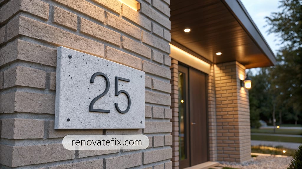 Cast concrete plaques featuring raised numerals mark addresses with style.