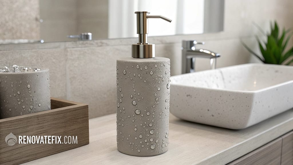 Sleek concrete vessels fitted with pump mechanisms elevate bathroom accessories.