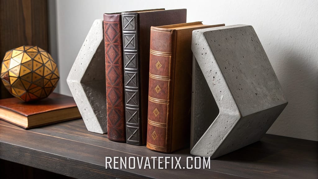 Substantial concrete blocks featuring angular cuts secure book collections while making artistic statements.