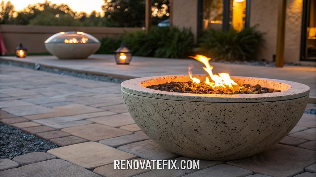Sculpted concrete basins fitted with heat-resistant materials form elegant outdoor fire features.