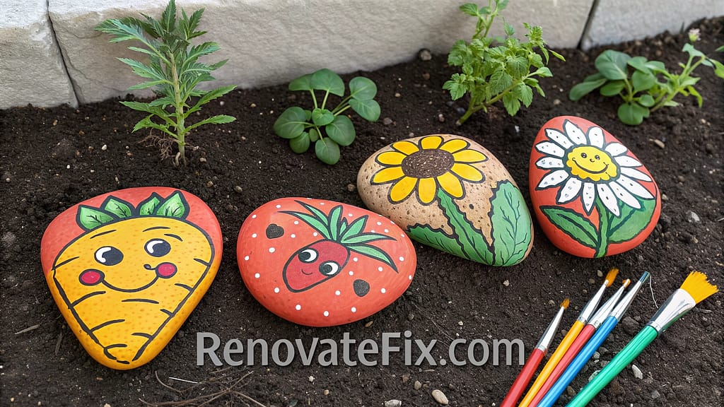 Children can gather smooth stones from outdoors, wash them thoroughly, then use acrylic paints to depict vegetables, fruits, flowers, or insects that might visit a garden.