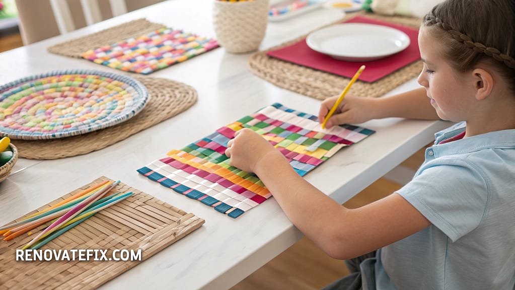 Woven paper placemats introduce basic textile concepts through accessible materials. Cut construction paper into long strips of various colors, then demonstrate simple over-under weaving patterns on contrasting base sheets.