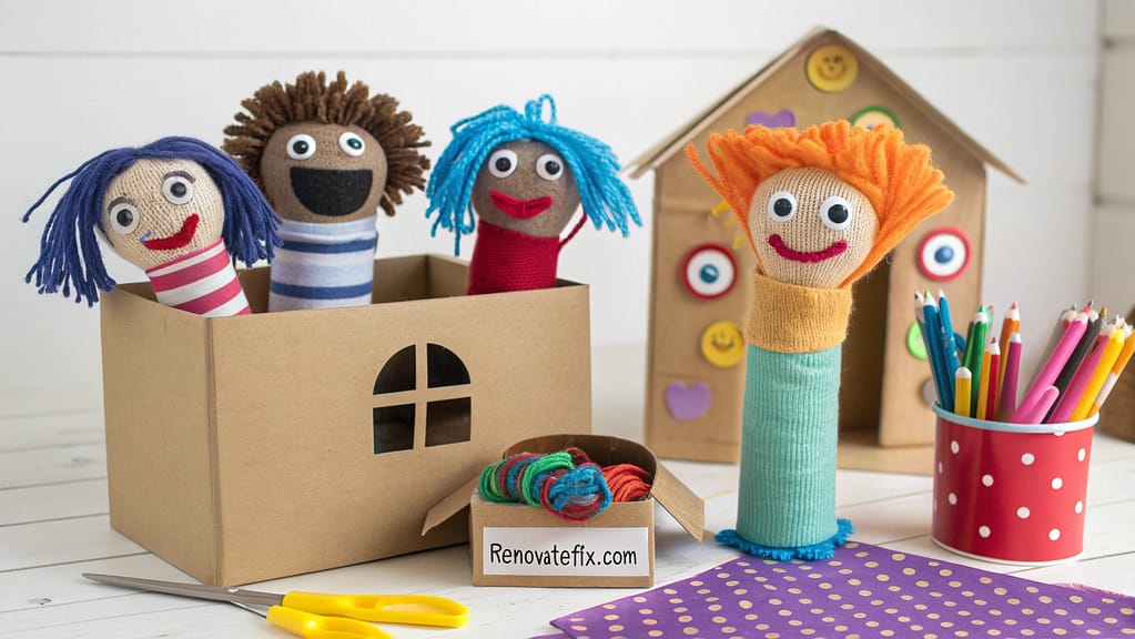 A puppet making station encourages storytelling alongside artistic development. Provide paper bags, old socks, wooden spoons, or felt sheets as puppet bases, then supply googly eyes, yarn hair, fabric scraps, and markers for character creation.