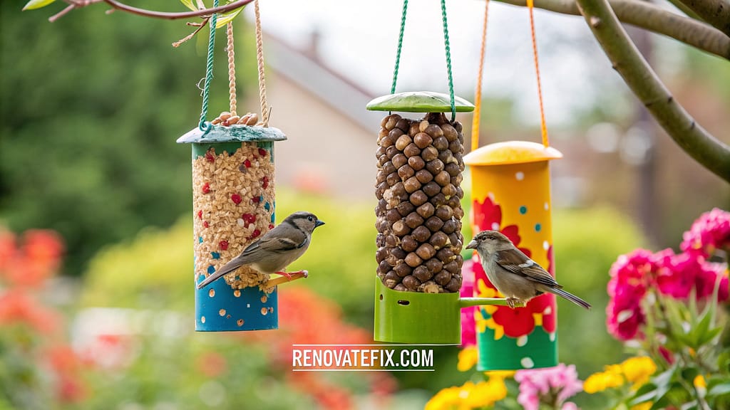 Alternatively, repurpose milk cartons or plastic bottles by cutting feeding holes, adding perches from wooden dowels, and decorating exteriors with weather-resistant paint before filling with birdseed.