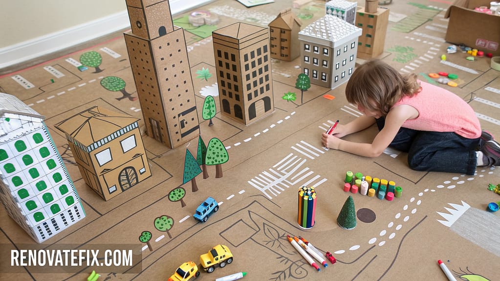 Add details like bottle cap wheels on cars, popsicle stick benches, and paper trees to complete neighborhood scenes that foster storytelling skills during hours of imaginative play.