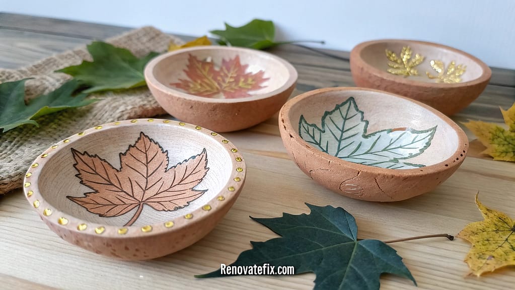 Clay leaf bowls combine natural impressions with functional pottery. Children roll air-dry clay into flat circles before pressing actual leaves onto surfaces, creating detailed vein patterns when gently removed.