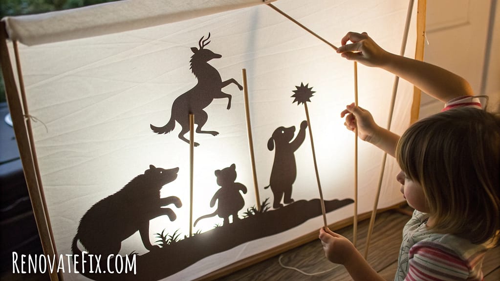 When flashlight shines behind puppets, shadows cast magical displays for storytelling performances that combine visual arts with narrative development—encouraging collaboration when multiple children operate different character puppets.