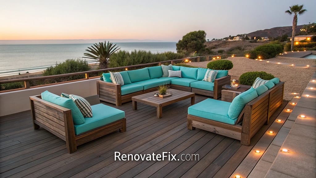 Utilizing weather-resistant materials like teak, polyethylene wicker, or powder-coated aluminum paired with plush, moisture-resistant cushions in complementary colors or patterns that harmonize with your exterior home palette.