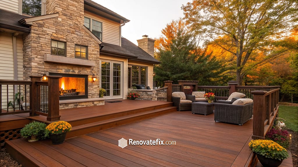 A warm, medium-toned brown with orange-red undertones that evoke fall foliage, creating year-round seasonal warmth in outdoor living areas.