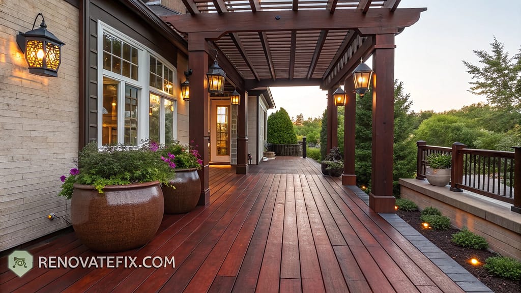 Rich mahogany makes a bold statement while remaining timeless, particularly effective for highlighting architectural details in custom deck designs.
