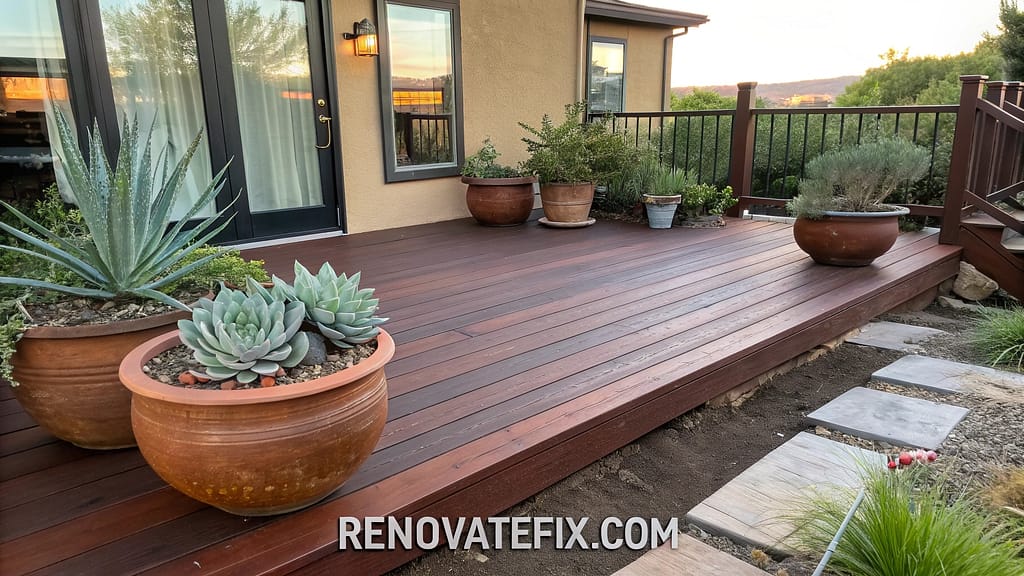 Image prompt: Rustic brown stained deck with medium-dark coloration, Southwestern style outdoor furnishings, terracotta pots with succulents, and evening sunlight accentuating the warm brown-red undertones