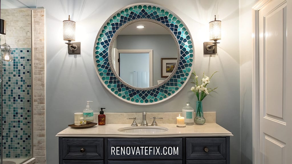 Refresh boring bathroom fixtures by adding sparkle around mirror edges using glass mosaic pieces.