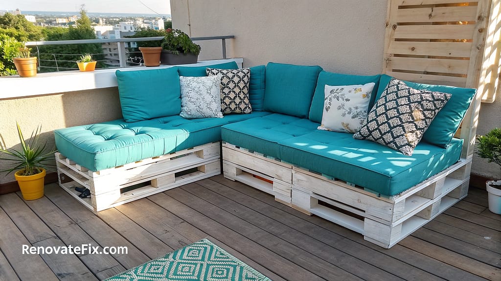 An outdoor sofa crafted from sturdy pallets offers both comfortable seating and concealed storage compartments beneath cushioned surfaces.