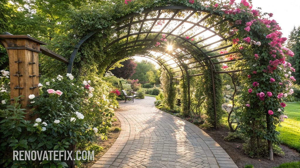 A curved garden archway constructed from bent pallet slats creates dramatic entrance points between different landscaped zones while supporting flowering vines.