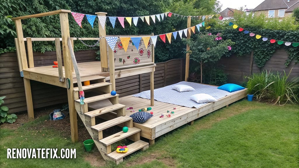 A raised play platform built from reinforced pallets provides youngsters with an outdoor stage for imaginative adventures while keeping them elevated from muddy ground after rainfall.