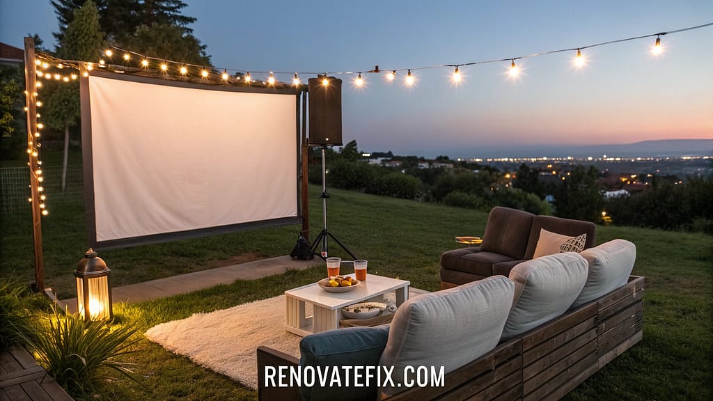 An outdoor cinema experience materializes with pallet boards fashioned into a sturdy projection screen frame for family film nights under stars.