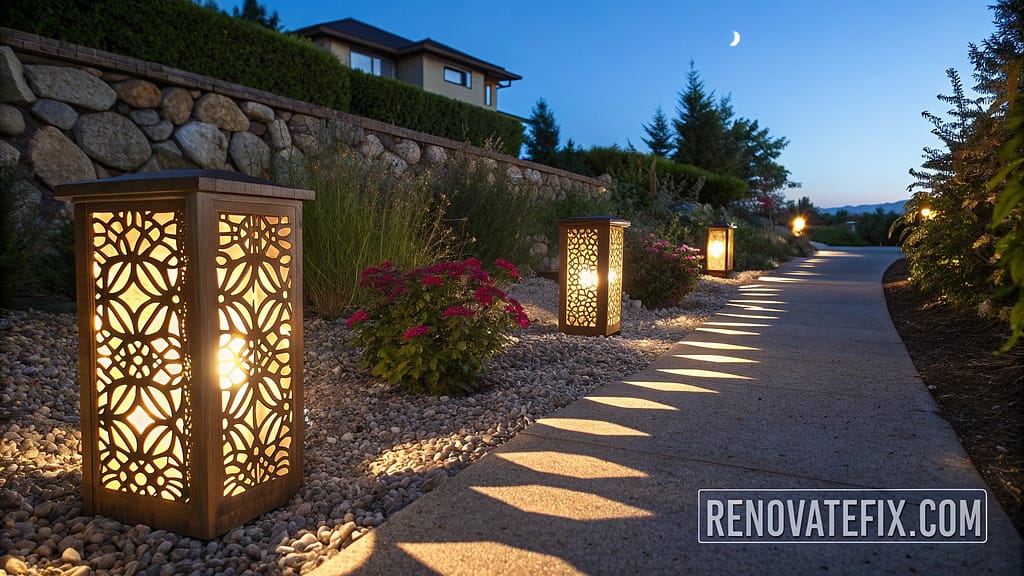 Cut pallet pieces shield light sources from direct view, casting interesting shadow patterns across walkways and highlighting adjacent plantings.
