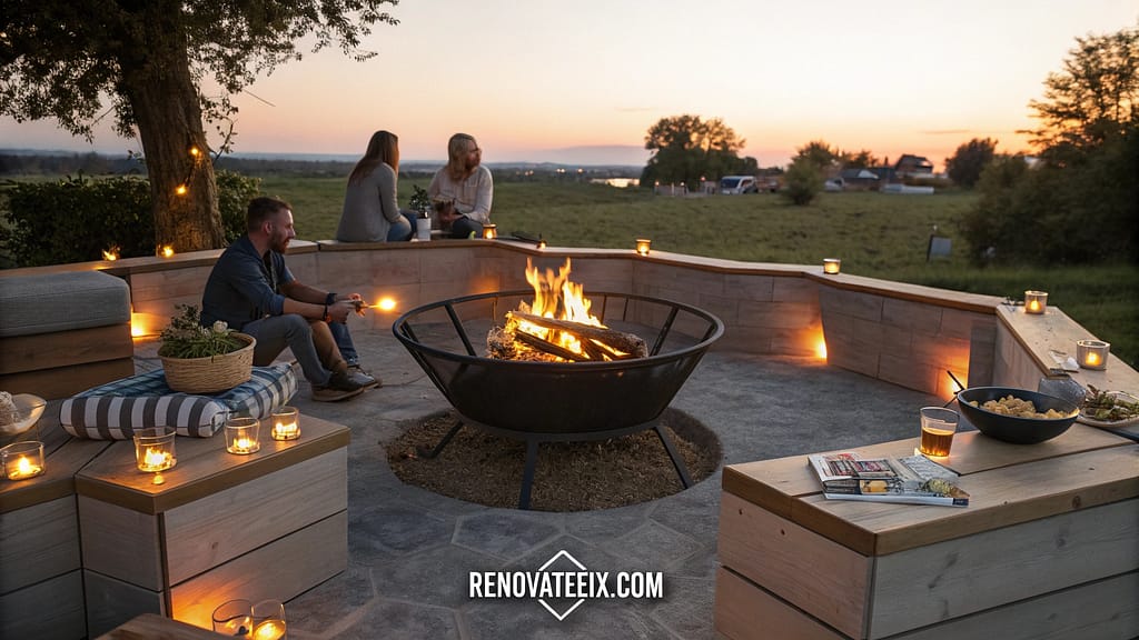 A modular fire pit surround constructed from pallet sections creates comfortable seating around outdoor flame features without permanent installation requirements.