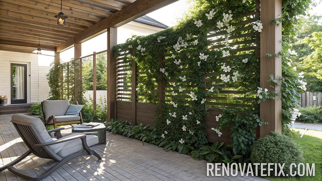 An outdoor privacy screen assembled from vertical pallets creates secluded areas within open garden spaces while providing ideal support structures for climbing plants.