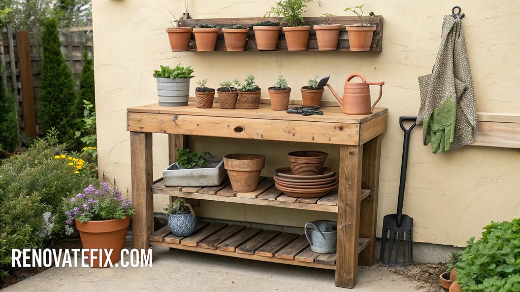 A dedicated potting station fashioned from reclaimed pallets streamlines gardening preparations with allocated spaces for soil, containers, and transplanting activities.