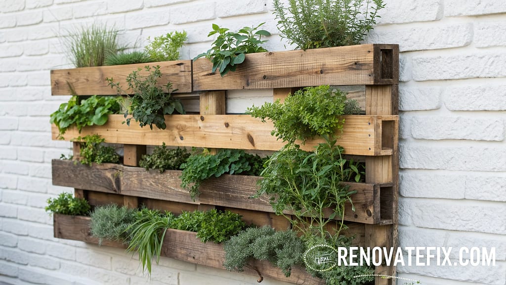 A wall-mounted vertical herb garden constructed from reclaimed pallets maximizes growing space in compact areas while adding visual interest to bland exterior walls.