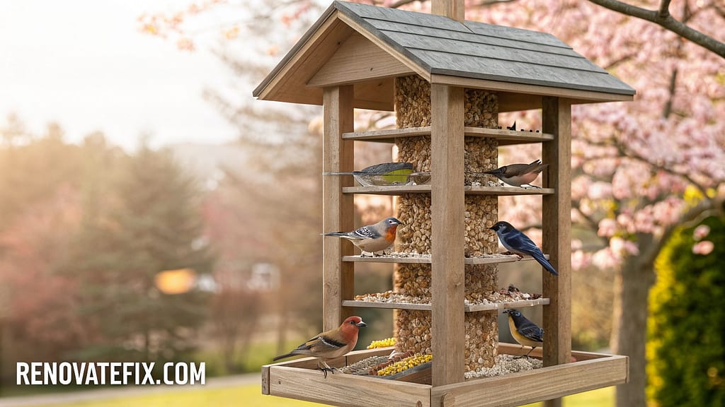 Multiple platform levels accommodate different seed types and feeding preferences, catering to diverse bird species throughout changing seasons.