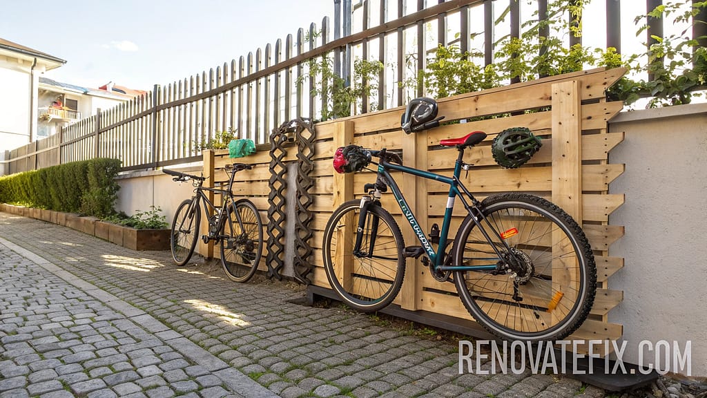 A wall-mounted bicycle storage solution crafted from disassembled pallets keeps recreational equipment organized while displaying interesting mechanical forms as decorative elements.