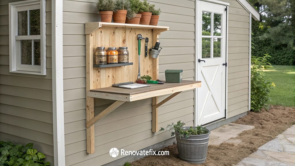 A wall-mounted fold-down workbench crafted from pallet materials provides functional workspace for outdoor projects without permanently occupying valuable patio areas.