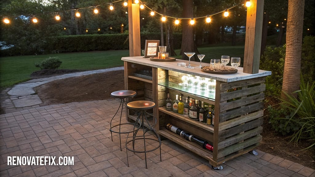 A freestanding rustic bar assembled from stacked pallets creates an entertainment hub for backyard gatherings without costly construction projects.
