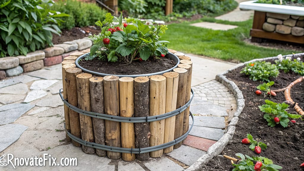 Arrange cut firewood logs vertically in circular formations, securing with exterior steel cables or bands, creating organic growing towers with excellent insulation properties for root development.