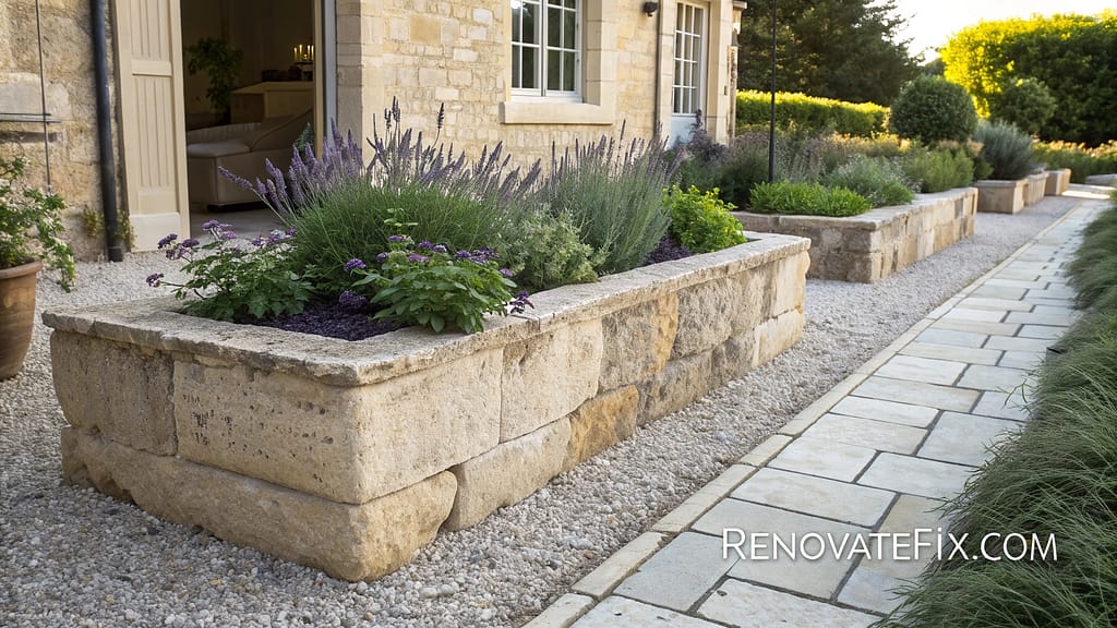 Arrange cut limestone blocks in staggered patterns without mortar, allowing slight gaps between stones for beneficial insect habitat while creating elegant formal planters with excellent thermal properties.