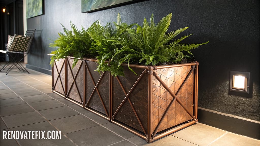 Assemble gleaming architectural planters using copper plumbing pipes and fittings, creating sleek modern forms that develop rich patinas while providing antimicrobial benefits to surrounding plants.