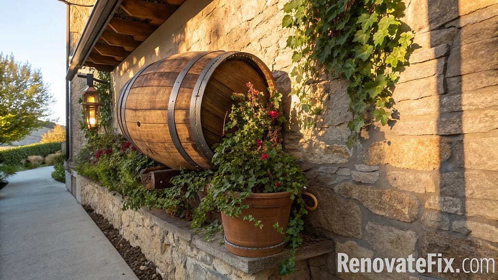 Split oak barrels vertically, reinforce curved sections with internal bracing, mount against walls or fences creating space-efficient growing areas with rustic charm.