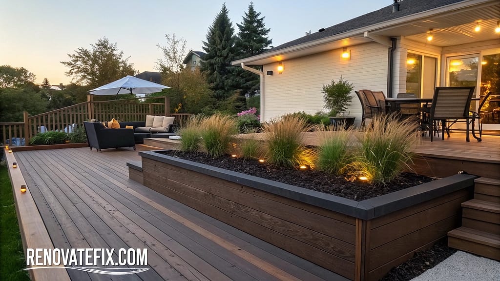 Integrate planting areas directly into outdoor living spaces by constructing raised boxes as borders around deck perimeters, creating seamless transitions between architectural elements and garden zones.