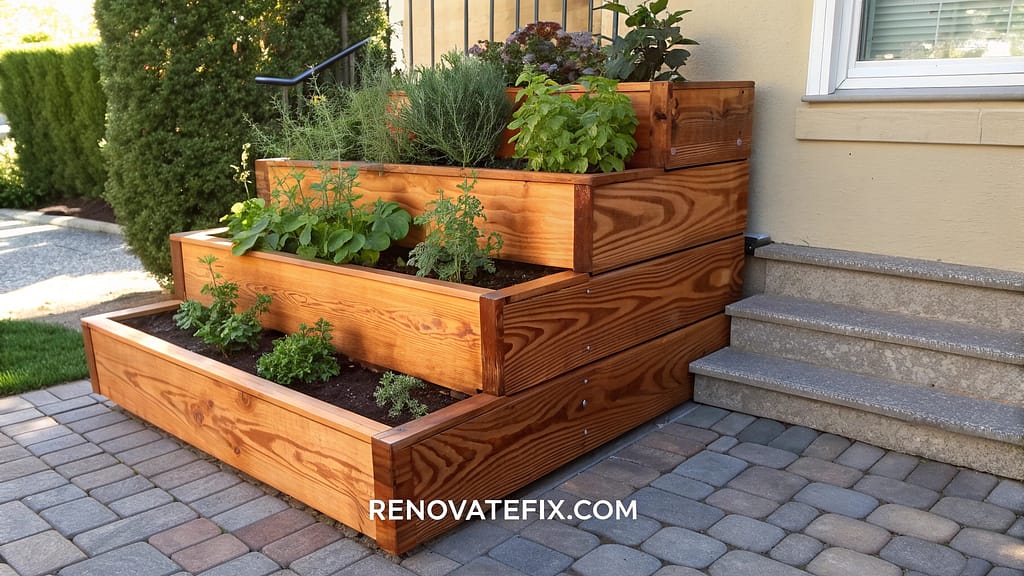 Construct multi-level growing stations from weather-resistant cedar boards, creating an eye-catching vertical garden that maximizes space in compact areas.