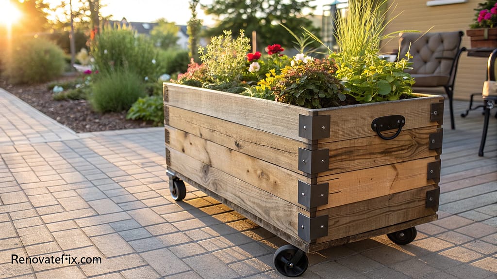 Fashion mobile growing spaces from reclaimed wooden shipping pallets, attaching heavy-duty casters for effortless repositioning to optimize sunlight exposure throughout seasons.