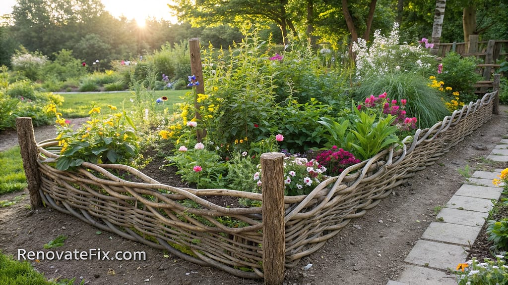 Create traditional cottage garden planters using hazel branches woven between wooden stakes, forming flexible barriers that naturally decompose over several seasons adding organic matter to soil.