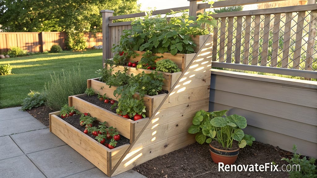 Construct wedge-shaped boxes decreasing in size as they ascend, install drip irrigation systems between levels for water conservation, and position taller crops at back with cascading varieties along fronts.