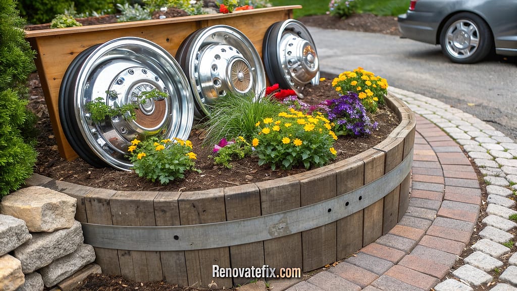 Mount vintage automobile hubcaps to wooden frames, creating unusual circular planters with metallic accents that catch sunlight and add whimsical elements to garden spaces.