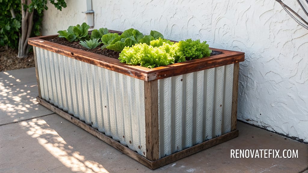Fashion industrial-style growing containers using agricultural roofing panels bent into rectangular forms, securing corners with metal brackets while creating striking material contrasts against organic plantings.