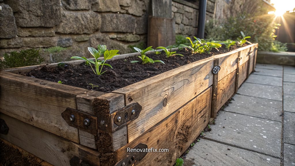Apply food-safe sealant if growing edibles, ensuring old creosote-treated wood is avoided for vegetable gardens.